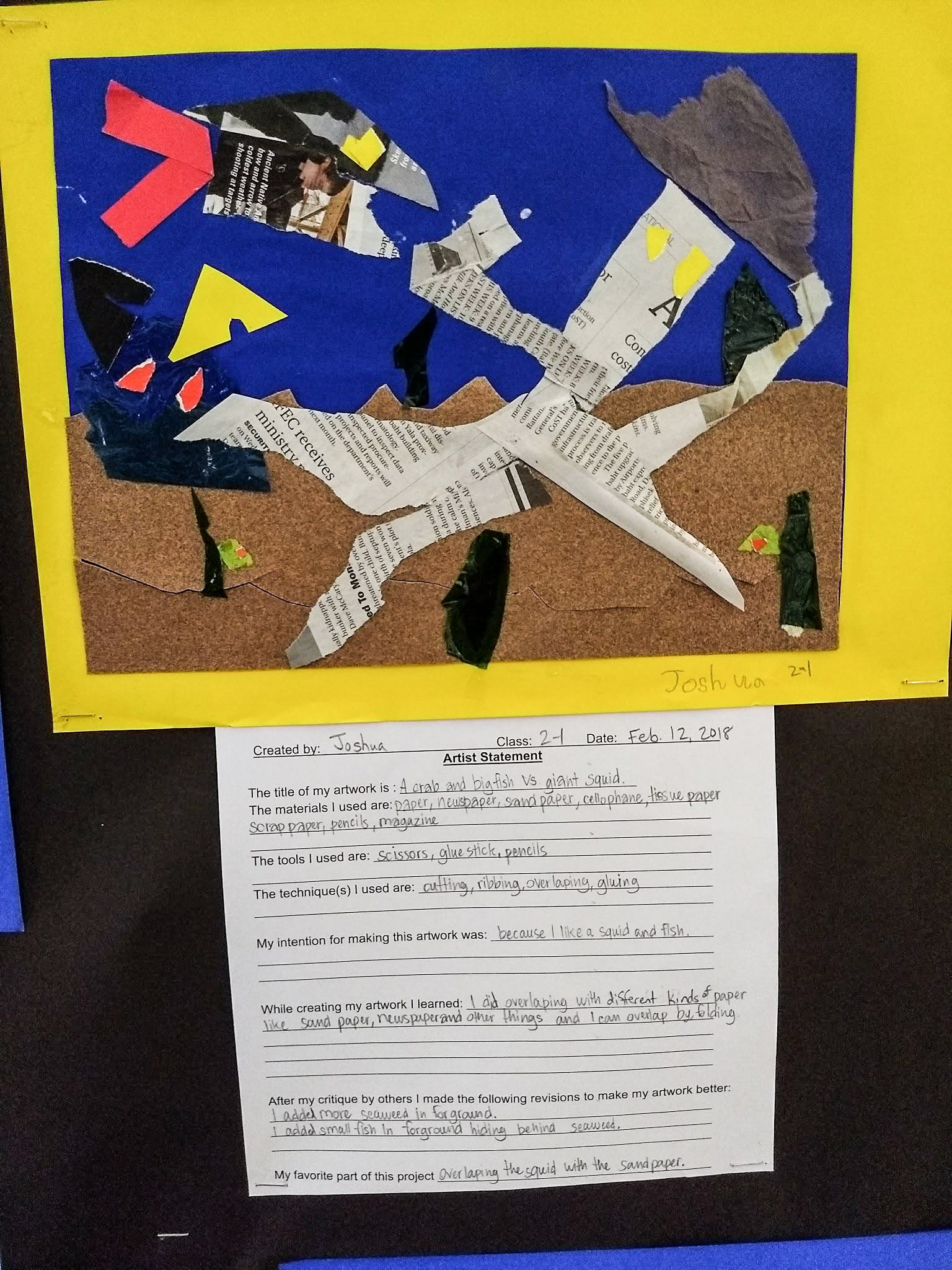 The PreK 2, 3, and 4 groups explored the clay form and made “elbow pots” and pinch pots. The Kindergarten, 1st, and 2nd grade students worked in the “Collage Center,” experiencing all the steps of the creative process, from brainstorming to exploring to practicing, researching, creating, and critiquing. Each of their final pieces of artwork was framed and displayed with their individual “artist statement.”