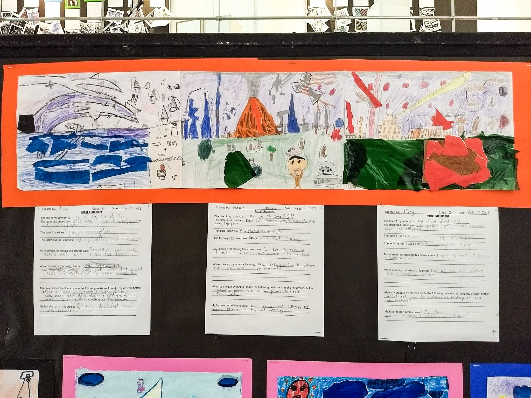 Several ES classes were taken to explore the gallery so they could see the variety of creative artwork on display. One PreK child was so excited to see an older student’s project about flags that a friendship blossomed from the experience. Check out Kyleigh Pharris’ article, Inspiring a Friendship: How Art Connected Two Young Children, to read about the heartwarming relationship that was kindled by a walk through our ES Spring Art Show.