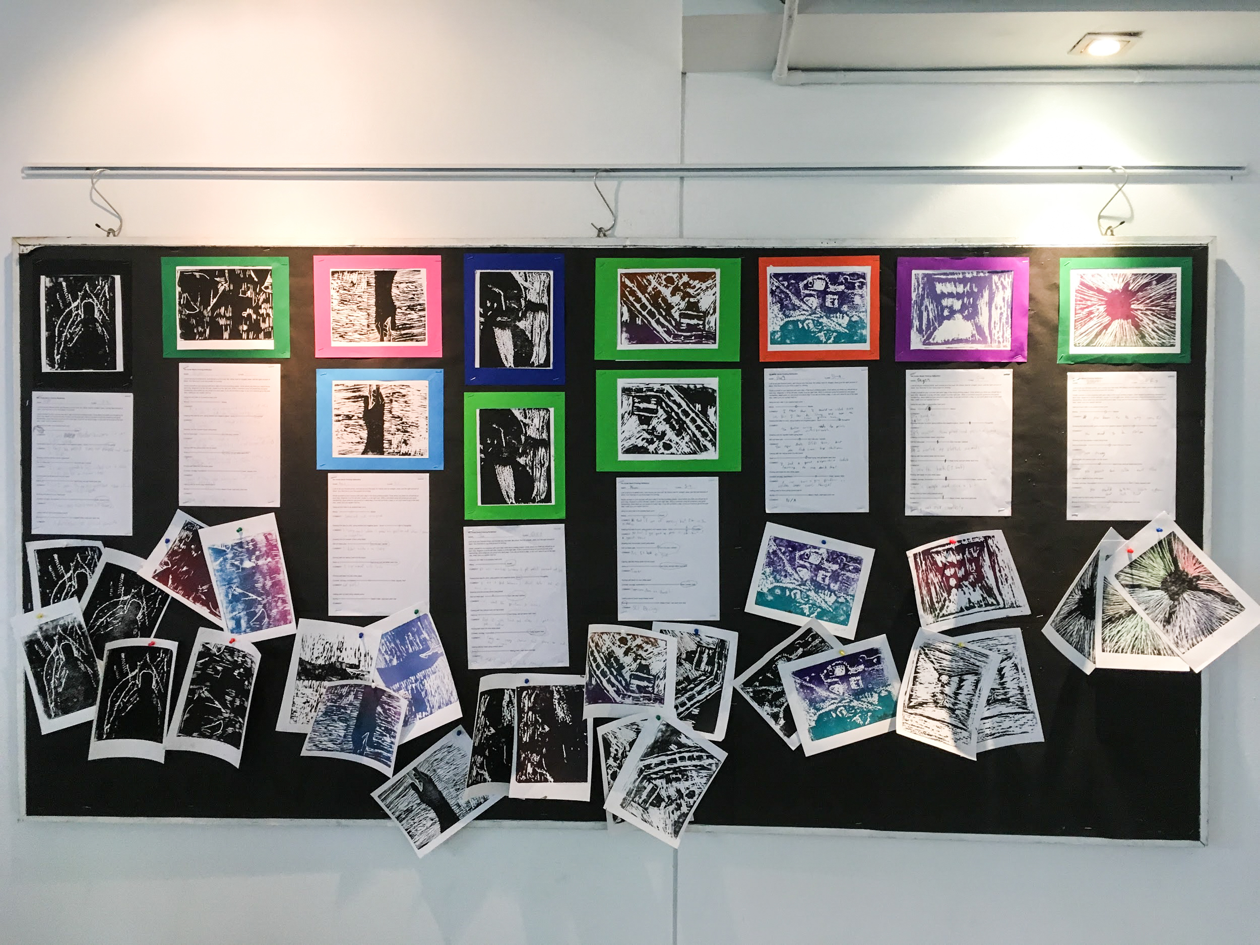 The 3rd graders displayed moving shadow wheels that they made during the Science Showcase. Our 4th grade students painted self-portraits illustrating a favorite sport, real or imagined. The students in 5th grade made hand-cut woodblock prints. Many of them worked for months to carve their piece of wood using special tools and lots of patience. All of the students wrote reflections about their work and progress.