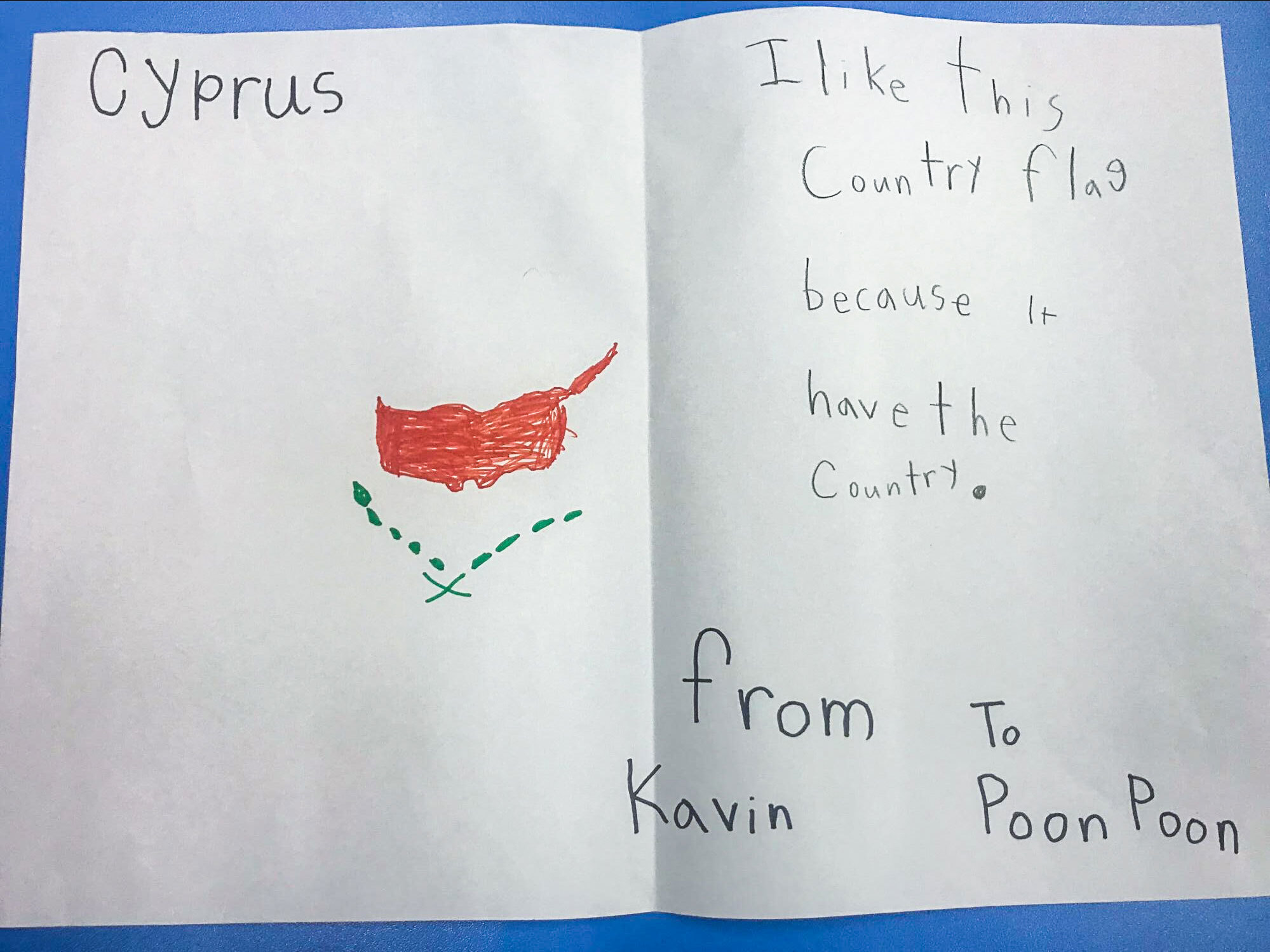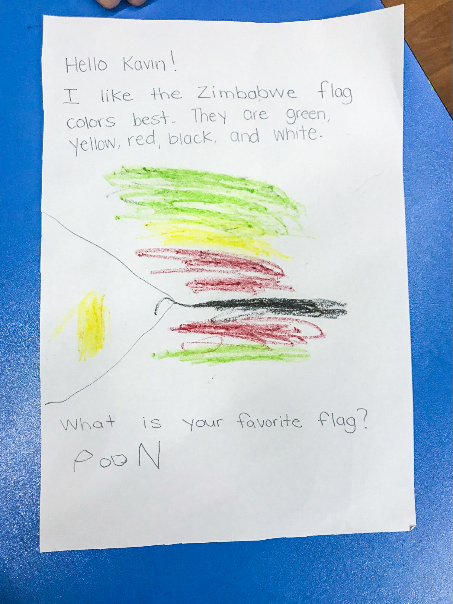 While their teachers wanted to support the boys’ friendship, it proved to be tricky to coordinate times for the KG and PreK 4 classes to collaborate; the only common times for the classes to be together was during snack and lunch. After days of not having enough time to discuss their love of flags and countries, Poon Poon asked if he could draw Kavin a flag and mail it to him. Poon Poon and his teacher discussed options for how to mail his flag art to Kavin. After a lengthy conversation, they concluded that putting Poon Poon’s art in Kavin’s teacher’s mailbox would be a dependable way to ensure that Kavin would receive Poon Poon’s flags. This idea sparked an ongoing pen-pal relationship.